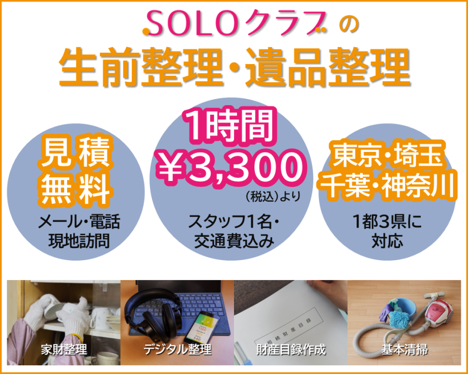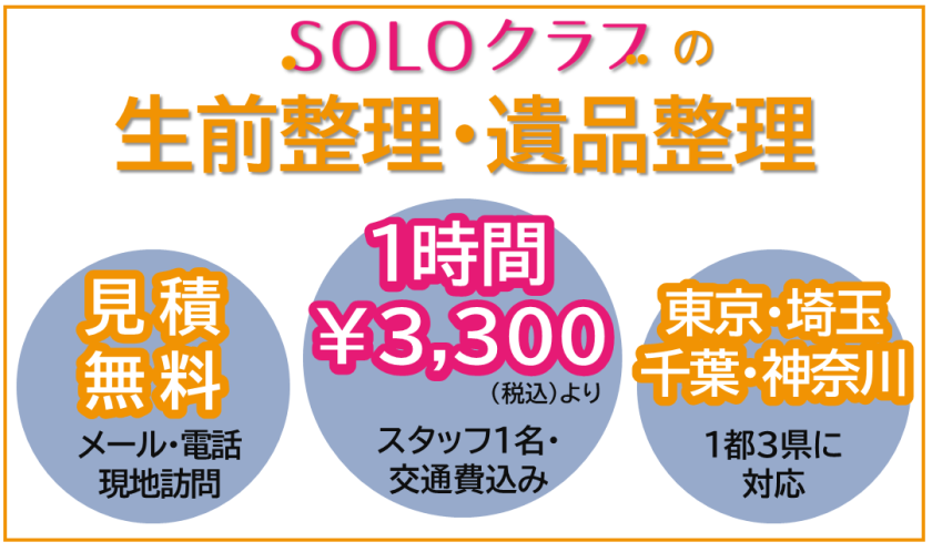 SOLOクラブでは1都3県エリアを対象とした生前整理、遺品整理サービスを提供いたします。